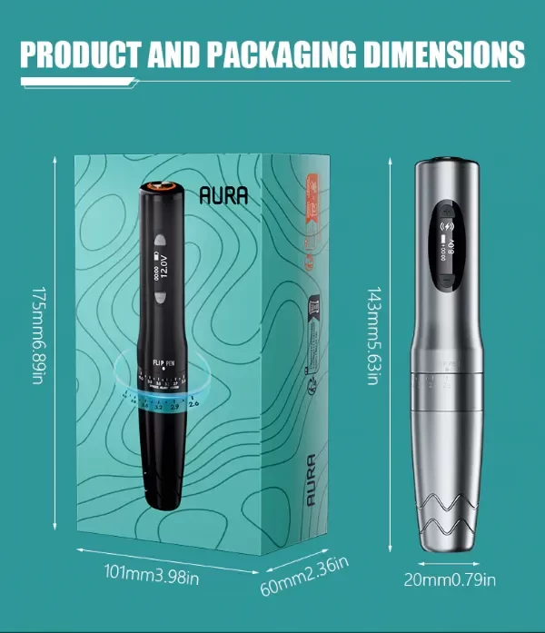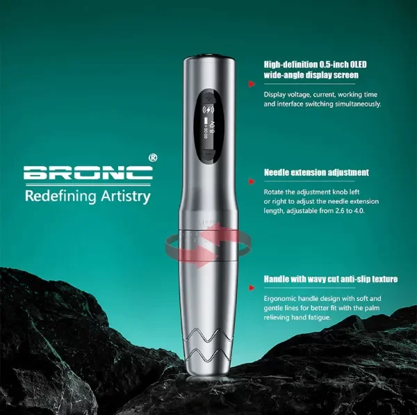 La BRONC AURA redefine la comodidad en el tatuaje inalámbrico. Con solo 137 gramos, es una de las máquinas más ligeras del mercado, diseñada específicamente para reducir la fatiga en sesiones largas sin sacrificar potencia. Su característica estrella es el Stroke ajustable, que te permite adaptar la máquina a cualquier estilo en segundos.