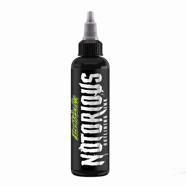 Electrum Notorious® Black - La Tinta Definitiva para Líneas Logra líneas nítidas, limpias y de un negro azabache profundo que no se desvanece. Diseñada para un flujo rápido "como mantequilla" y una saturación intensa, esta tinta garantiza una cicatrización oscura y verdadera sin expandirse (sin explosiones).